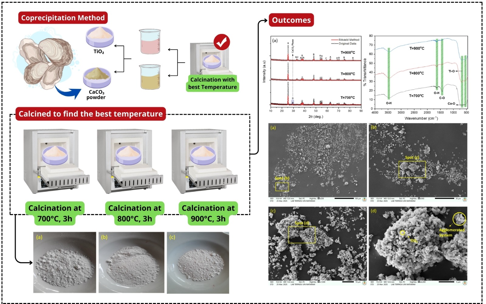 This study has succeeded in synthesizing and characterizing TiO2/CaTiO3 perovskite composites using calcium carbonate (CaCO3) from shellfish waste (Pinctada maxima). Synthesis was carried out through the coprecipitation method with variations in the molar ratio of CaCO3:TiO2 and calcination temperatures (700oC, 800oC, and 900oC). Characterization was carried out using FTIR, DTA-TG, XRD, SEM-EDS, BET and UV-Vis. The results of the analysis showed that the calcination temperature affected the powder color, crystal structure, thermal properties and particle size. The DTA-TG analysis shows that increasing the calcination temperature up to 900oC significantly reduces mass loss to 51.88%, with minimal thermal events, indicating the formation of a thermally stable and well-crystallized TiO2/CaTiO3 structure. At a temperature of 900oC, a more perfect CaTiO3 was formed with the whitest powder color, the anatase and brookite phases of TiO2 were still detected, while the calcite phase was still found at a temperature of 700oC. The morphology of the samples showed agglomeration with increasingly uniform particle sizes at higher calcination temperatures. Complementary BET analysis confirms that the composite possesses a mesoporous structure with a specific surface area of 11.42 m2/g and a pore size distribution of 3-5 nm, making it suitable for adsorption and photocatalytic applications. UV-Vis analysis showed an increase in the band gap value along with the increase in the TiO2 ratio. This is also confirmed by the presence of Urbach energy which tends to increase with increasing TiO2 ratio.