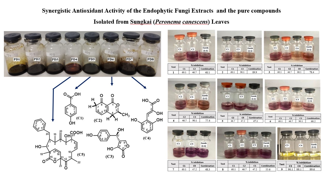 Endophytic fungi extracts have various biological and pharmacological activities as natural antioxidants which have the potential to be developed in the pharmaceutical. Drugs made from natural substances frequently work best when they are present in large quantities. This may result in unfavorable side effects from using more of one substance at a time. This limitation can be overcome by using a combination of the extracts/pure compounds that allow synergistic interactions with strong antioxidant properties at fairly low concentrations. The purpose of this research was to determine the combined effect of endophytic fungi extracts and its pure compounds on their antioxidant activity. This research was initiated by rejuvenating eight selected endophytic fungal isolates from Sungkai leaves and morphological characterization was carried out. Each fungus was cultivated in PDB medium for 4 weeks under statistical conditions. Ethyl acetate was used to extract the endophytic fungi’s liquid culture, which was then evaporated. Each endophytic fungal extract (PD1-PD8) and their five pure compounds were tested for antioxidant activity by the DPPH method. Then a combination of two and three extracts was carried out with a ratio of 1:1. The results show that the interaction of the mixture of endophytic fungi extracts and their pure compounds can be classified as synergistic (combined effect of the extracts > individual effects), additive (combined effect of the extracts = individual effect), and nothing is antagonistic (combined effect of the extracts < individual effects). The best combination in this study was PD4+PD5+PD6 (1:1:1) which could be used as a formula for further research into in vivo immunostimulant tests. Another conclusion from this research is that the pure compounds contained in the extracts have lower antioxidant activity than the extracts and do not have a synergistic effect on the combination.