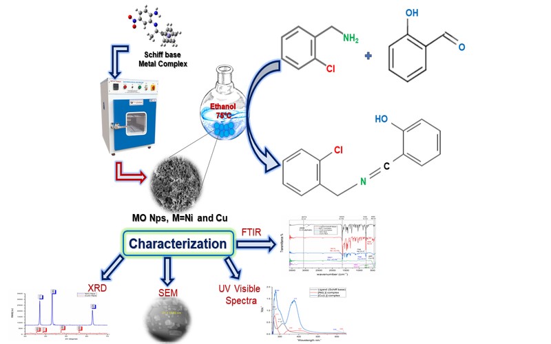 This study reports the synthesizes of such as copper oxide (CuO) and nickel oxide (NiO) nanoparticles (NPs) by thermal decompositions of Schiff base complexes and their physical characterization. A polydentate Schiff base ligand, (E)-2-(((2-chlorobenzyl)imino)methyl)phenol (CIMP), was synthesized by condensing 2-chlorobenzylamine and 2-hydroxybenzaldehyde. The ligand was identified by melting point, FT-IR, UV-Vis, and (1H and 13C NMR) spectroscopy. Cu(II) and Ni(II) complexes were prepared by reacting CIMP with the corresponding molar ratio in a 1:1 (metal: ligand). The complexes (Com1 and Com2) were characterized by melting point, FT-IR, and UV-Vis spectroscopy. The FT-IR spectra of the (Com1 and Com2) showed that the deprotonated CIMP ligand coordinated to the Ni(II) and Cu(II) metal ions through the azomethine nitrogen, aryl chloride, chlorine, and phenolic oxygen atoms. To determine the crystalline structure of the synthesized products, X-ray powder diffraction (XRD) and scanning electron microscopy (SEM) techniques were employed. The formation of copper oxide and nickel oxide as the new products was confirmed by XRD analysis. SEM imaging revealed the uniform and spherical morphology of the nanoparticles, which exhibited a remarkably narrow size distribution with an average diameter of 20 to 22 nm, highlighting their exceptional precision